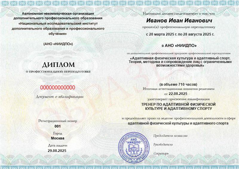 - Квалификация: Тренер по адаптивной физической культуре и адаптивному спорту