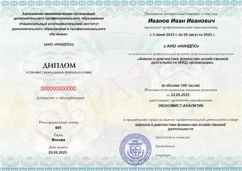 - Диплом с присвоением квалификации «Экономист-аналитик» по программе дополнительного профессионального образования «Бухгалтерский анализ и диагностика финансово-хозяйственной деятельности (ФХД) организации»
