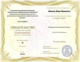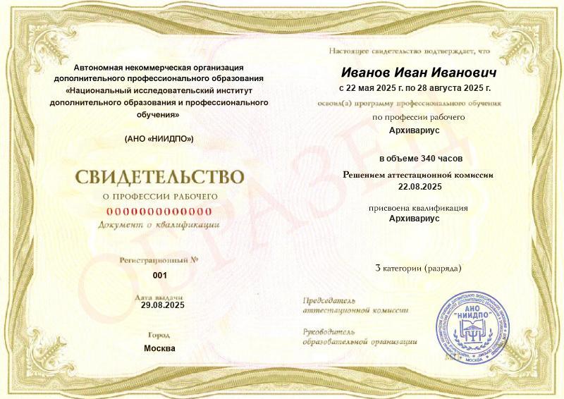 - Свидетельство о профессиональном обучении с присвоением квалификации архивариуса