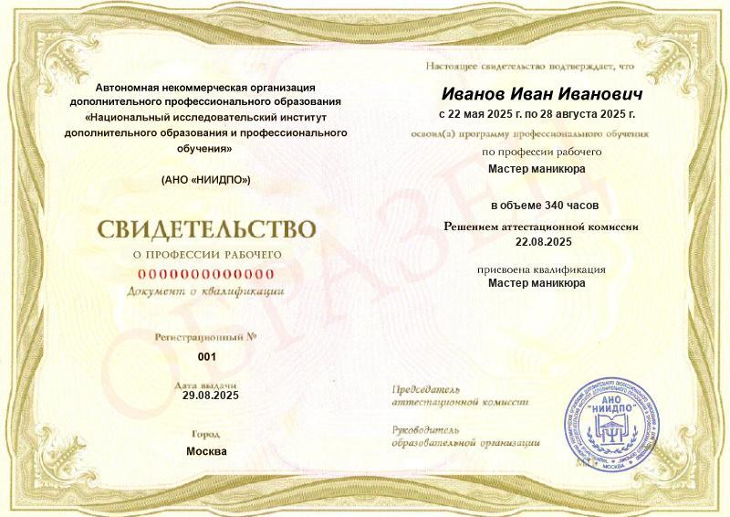 Обучающимся, завершившим обучение по основным программам профессионального обучения и успешно сдавшим квалификационный экзамен, выдается документ о квалификации – свидетельство о профессии рабочего или свидетельство о должности служащего, установленного образовательной организацией образца (в соответствии с Приказом Минпросвещения России от 26.08.2020 № 438).