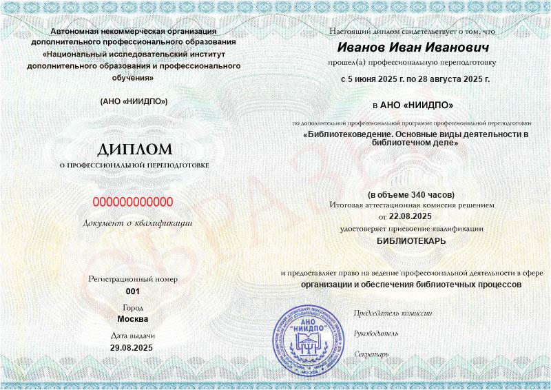 Курс на библиотекаря по программе профессиональной переподготовки реализуется заочно с применением дистанционных образовательных технологий и продолжается 12 недель (340 часов).