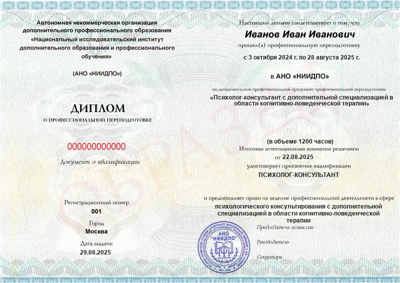 Психолог-консультант с дополнительной специализацией в области когнитивно-поведенческой терапии (1200ч)