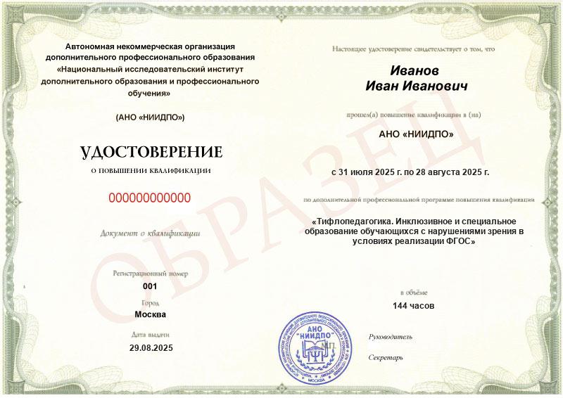 Тифлопедагогика. Инклюзивное и специальное образование обучающихся с нарушениями зрения в условиях реализации ФГОС (144ч)