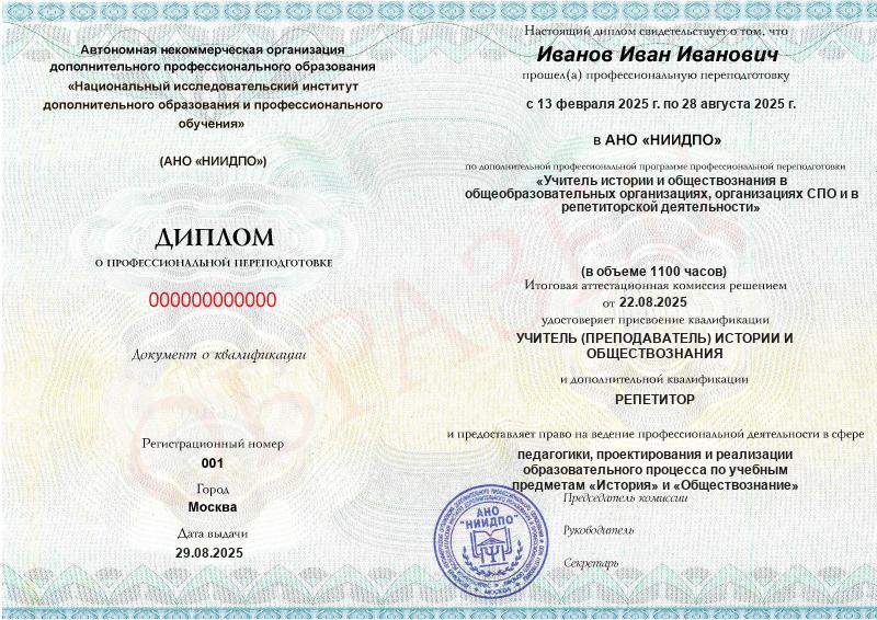 - 2 квалификации: Учитель (преподаватель) истории и обществознания + Репетитор